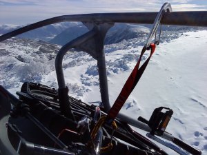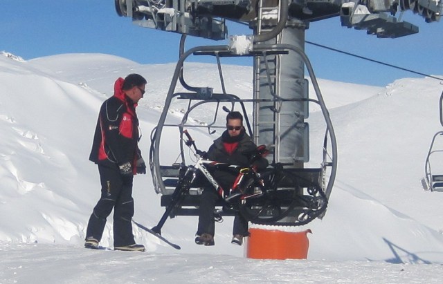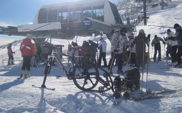 No hay problema para bajar la barra del telesilla; aunque no es posible bajarla del todo, es suficiente para que impida que nos caigamos. Mediante un mosquetón y una pequeña correa de seguridad (de escalada), se asegura la bicicleta a la silla para que en ningún caso se nos pueda caer: