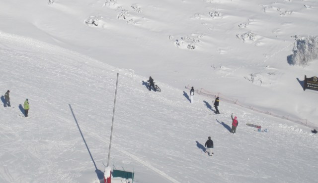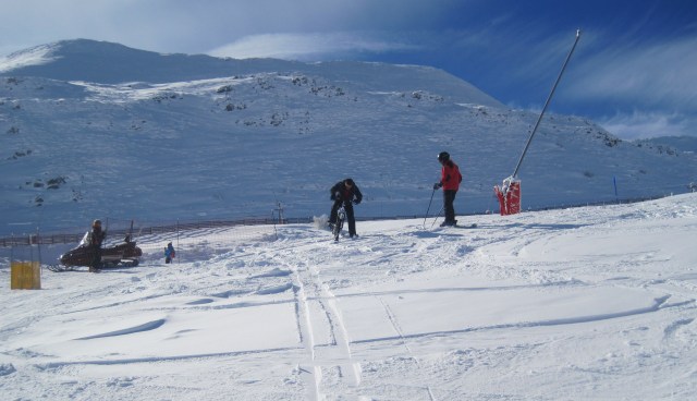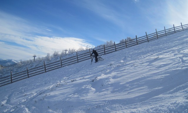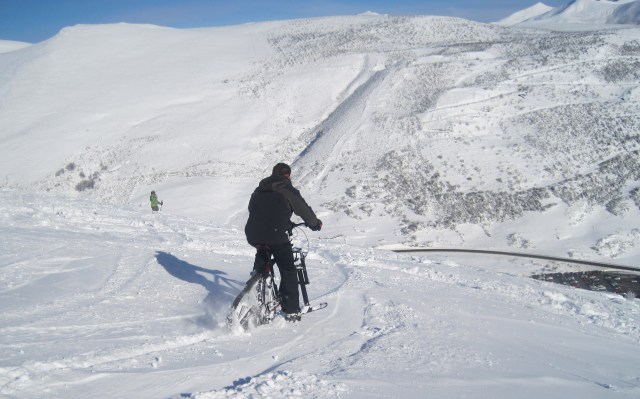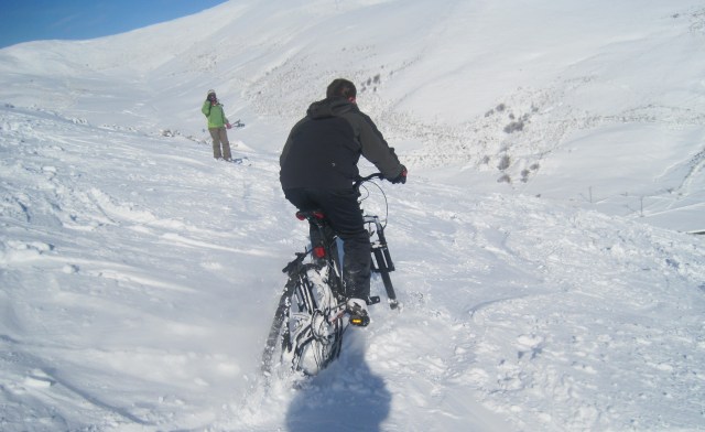 Pero en cuanto tomamos algo de pendiente, no importa la cantidad de nieve, ya que esquiamos con la bici… A diferencia del uso para llanear, en el descenso por una pendiente así, se agradece que la nieve esté suelta y sin pisar, ya que nos ofrece más control que si fuera una pista de nieve dura.