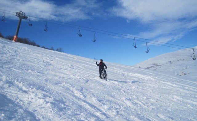 La velocidad no es excesiva, gracias a que la nieve no está tan dura como en las pistas, pero si no quieres embalarte mucho, en la parte más pendiente conviene hacer diagonales (igual que en el esquí); la misma técnica para pararte, te pones de lado a la pendiente y derrapas algo con la rueda. Los frenos aquí no sirven de nada…